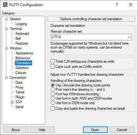 Enter the Raspberry Pi IP address, select SSH as connection type and under the menu item “Window” –> “Translation” select UTF-8
